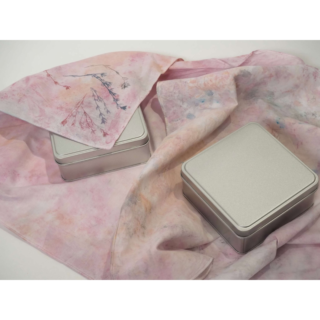 ムラ染めのコットンハンカチに植物刷りを施して、自由に詰めたクッキー缶を包みます。