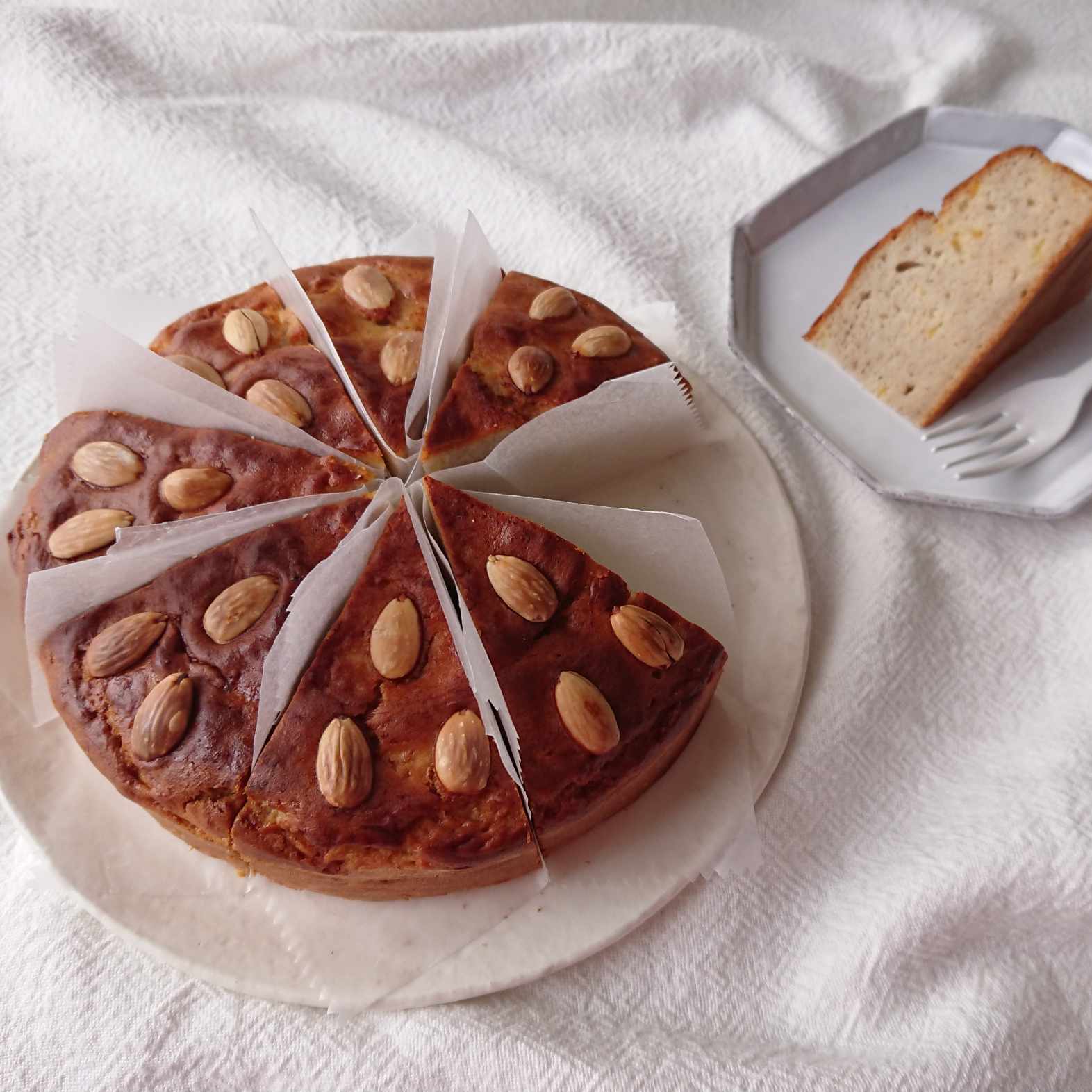 アーモンドと自家製マーマレードのケーキです。今月は白砂糖を使わない無農薬マーマレードにスパイスをプラス。