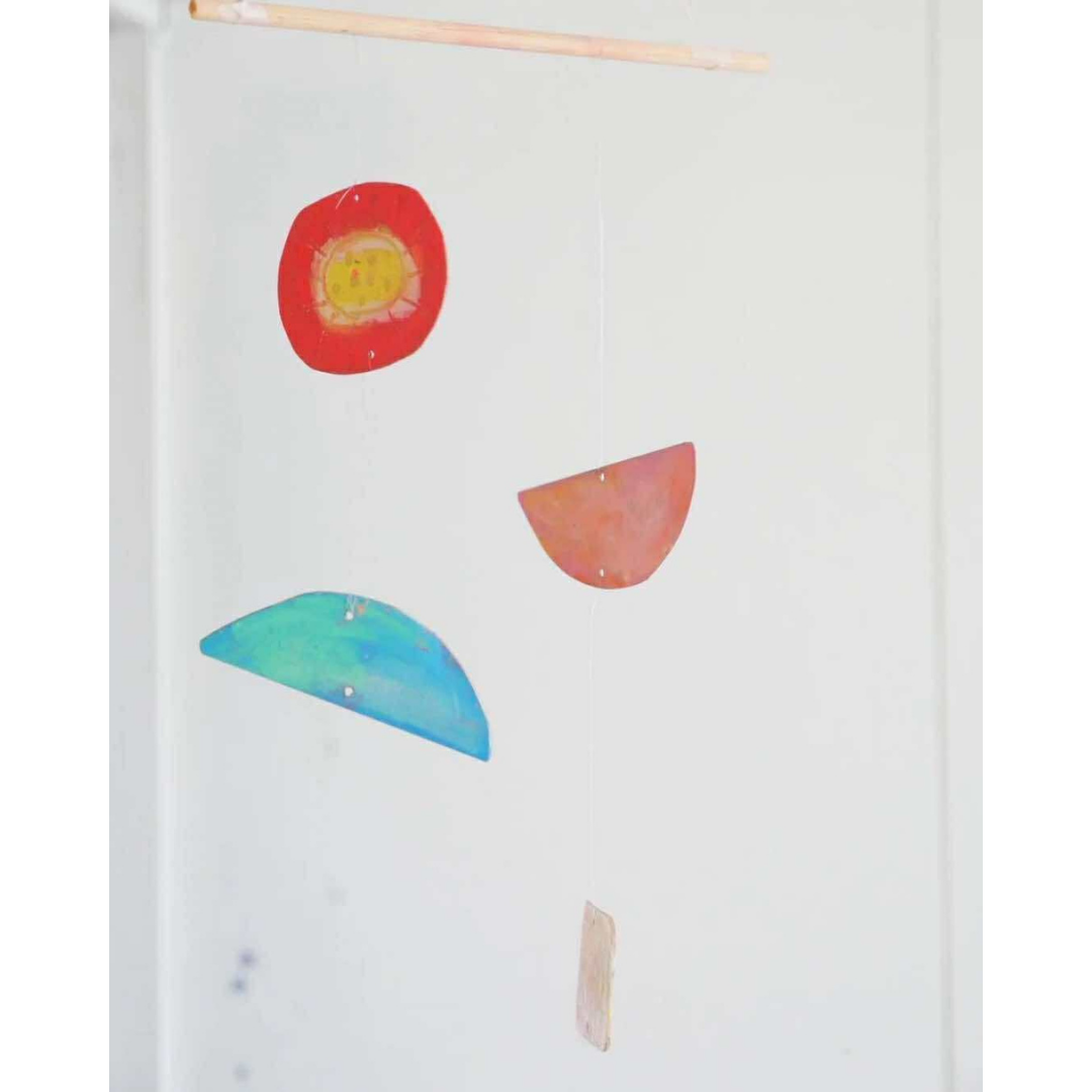 オイルパステルを指で伸ばして色を混ぜたりグラデーションにしたり、引っ掻いて模様をつけて、ユラユラモビールをつくろう!
