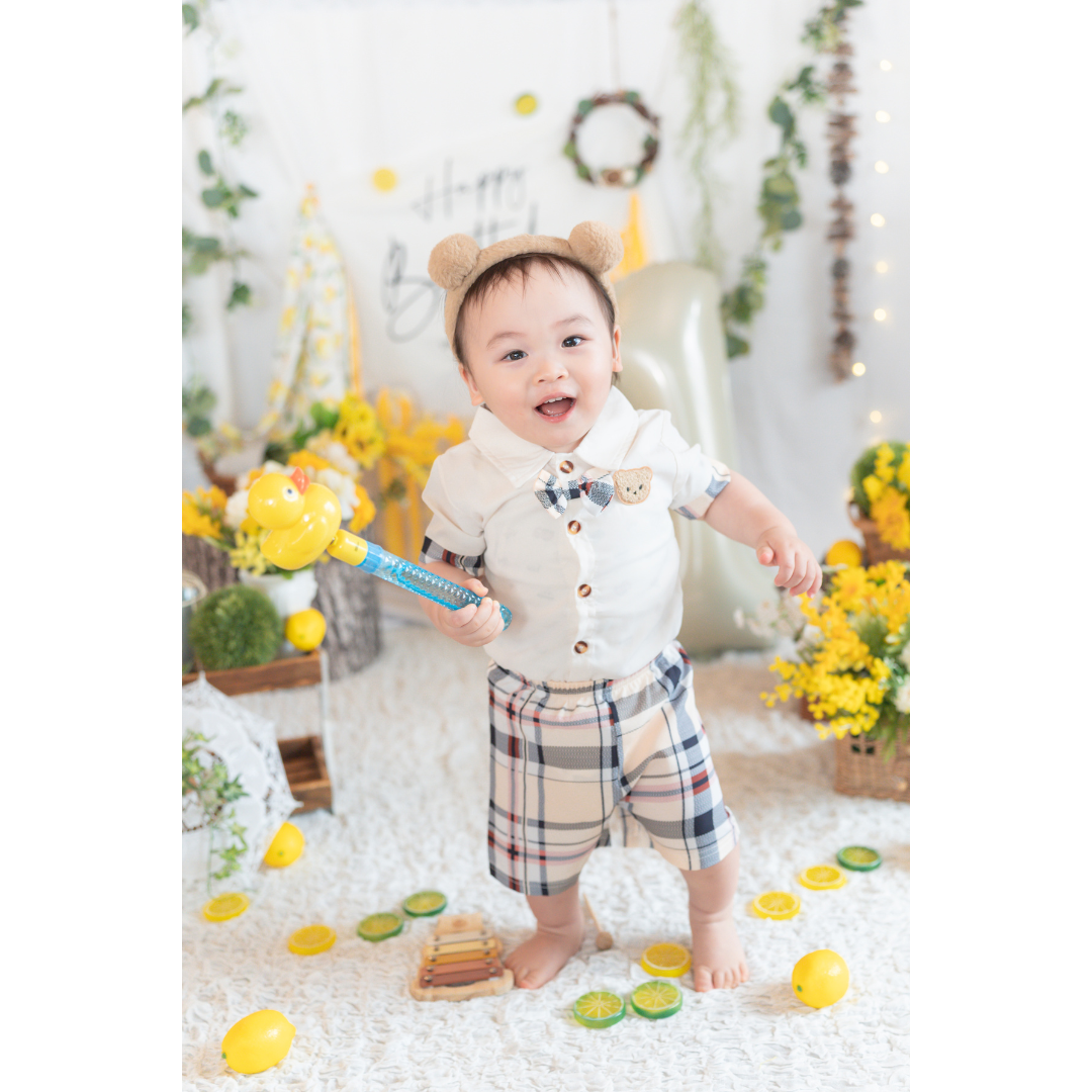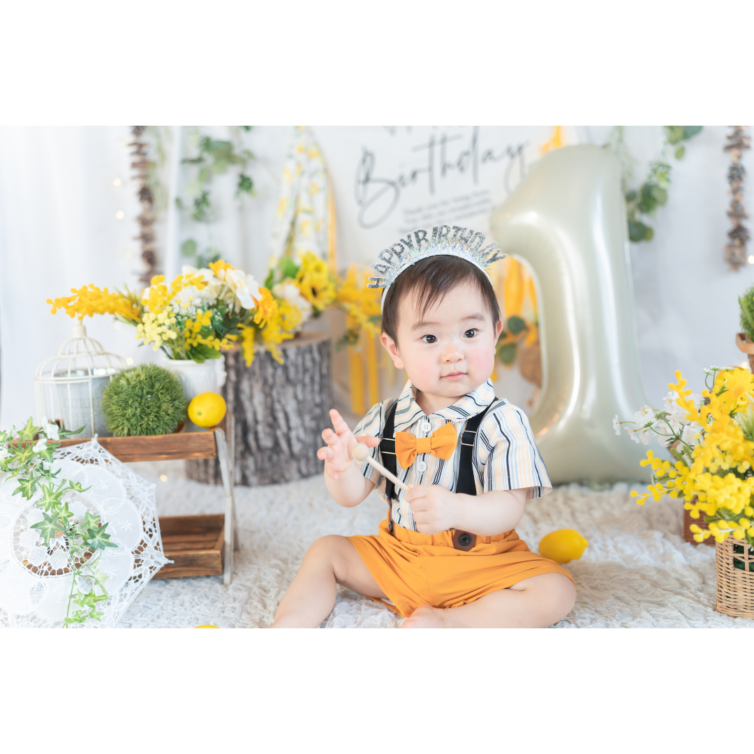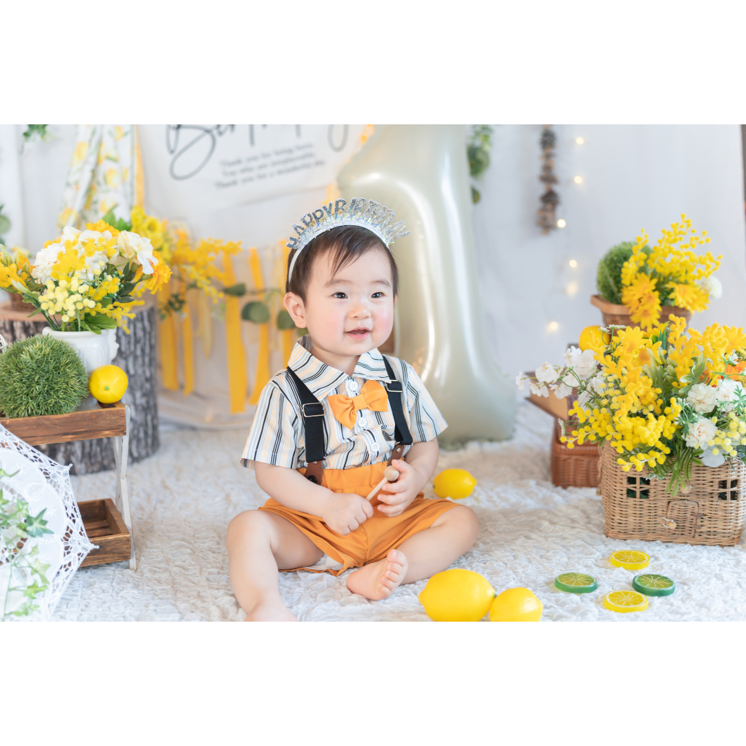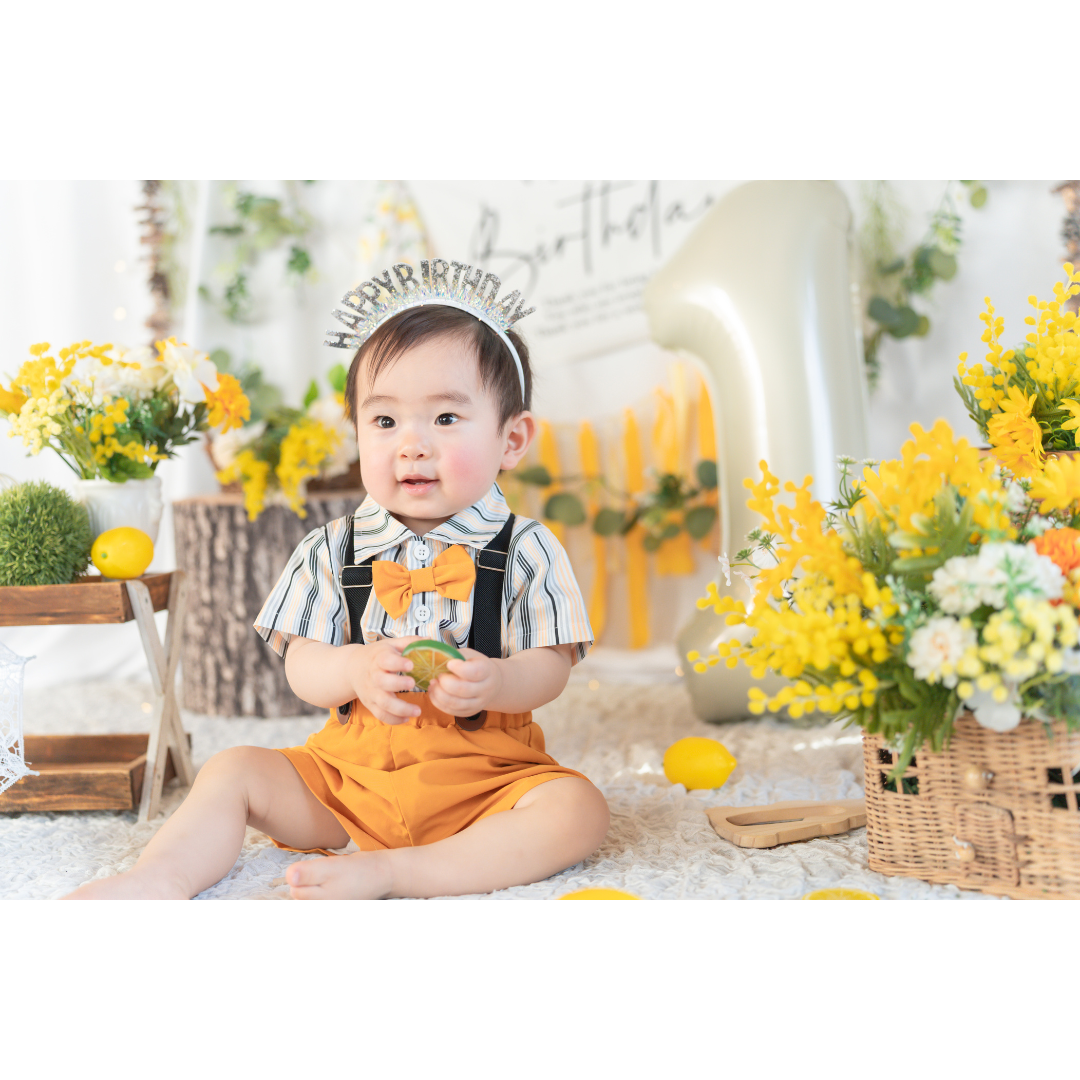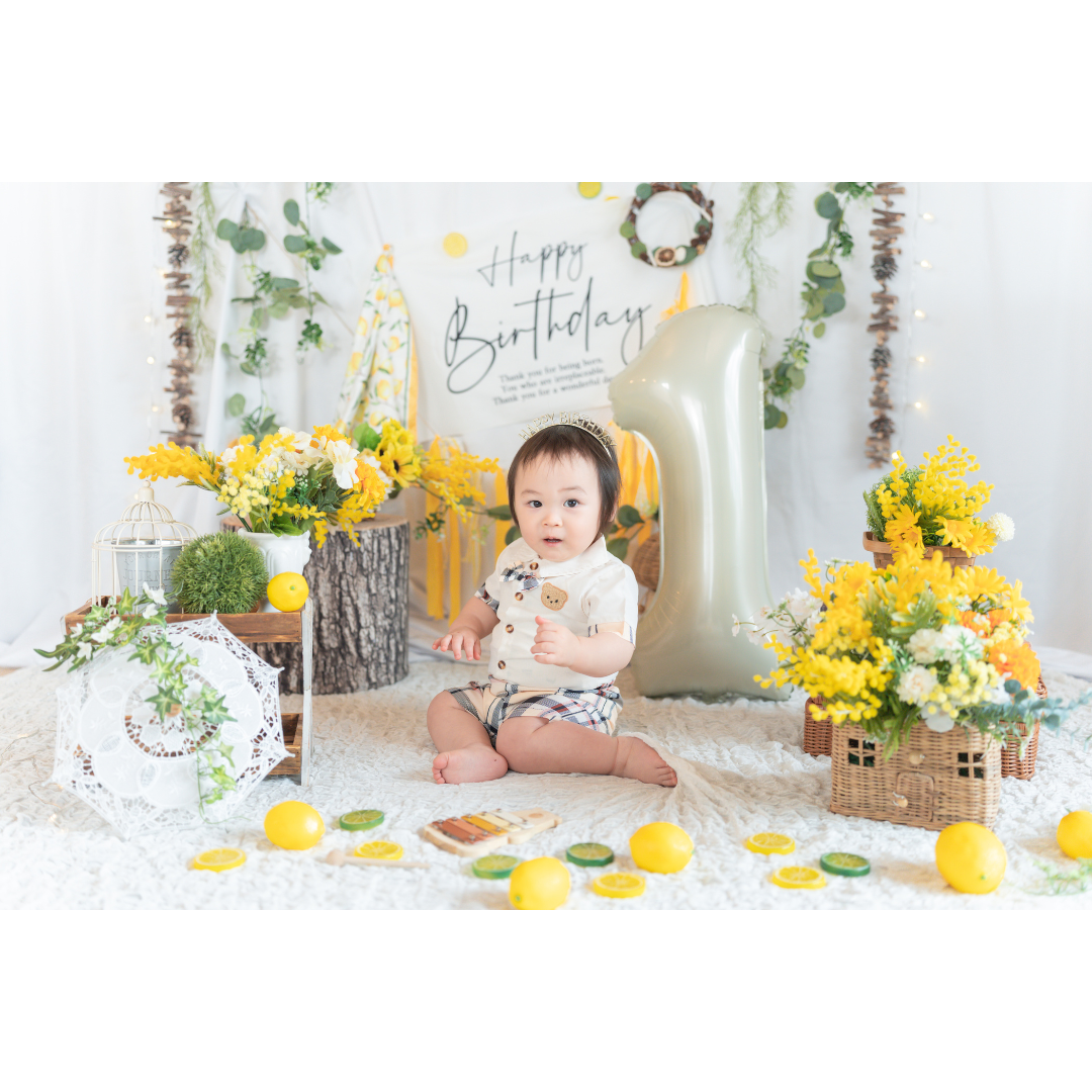 ふわふわの黄色いお花と、ナチュラルな木やレースの小物が、お子様の純真な笑顔を引き立てます。
