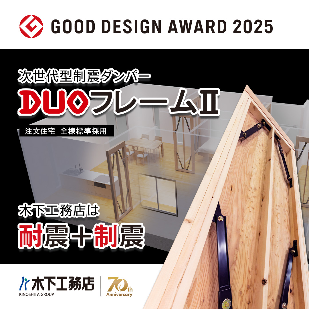 2025年度、木下工務店は『次世代型制震ダンパー「DUOフレームⅡ」』でグッドデザイン賞を受賞いたしました!✨ ◉次世代型制震ダンパー「DUOフレームⅡ」とは? 「DUOフレームⅡ」は、構造体を傷つけない設置方法で、455~910mmの壁幅にフレキシブルに対応します。 またダンパー設置のための専用壁の増設や、構造体の補強、間取りの変更も不要。理想の間取りにそのまま性能をプラスできるシンプル構造で、人の命と住まいを守ります。 グッドデザイン賞は、ものの美しさだけでなく、人や社会を豊かにするさまざまな分野のデザインに与えられる賞です。 木下工務店は、この名誉ある受賞を誇りに、これからもより多くの方々に豊かな住まいをご提供できるよう、成長を続けてまいります。