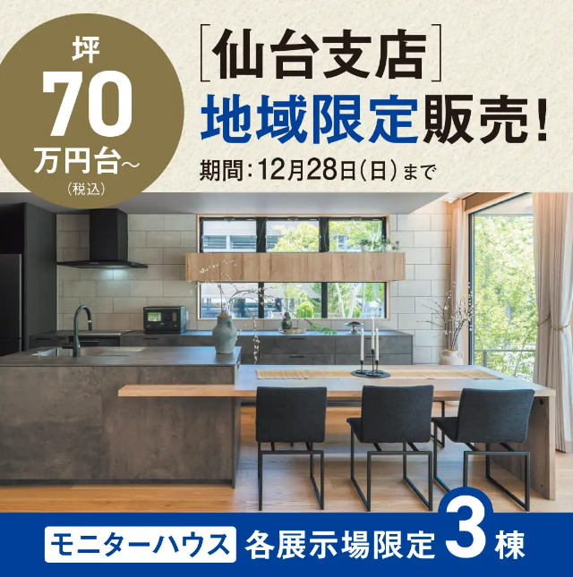 ご好評につき、「仙台支店」地域限定商品の販売期間延長が決定いたしました! 自由設計の住まいに、暮らしが豊かになる“上質な設備・仕様”を仙台支店のお客様限定でご用意しました。 各展示場限定3棟までとなっておりますので、お早めにご検討ください。