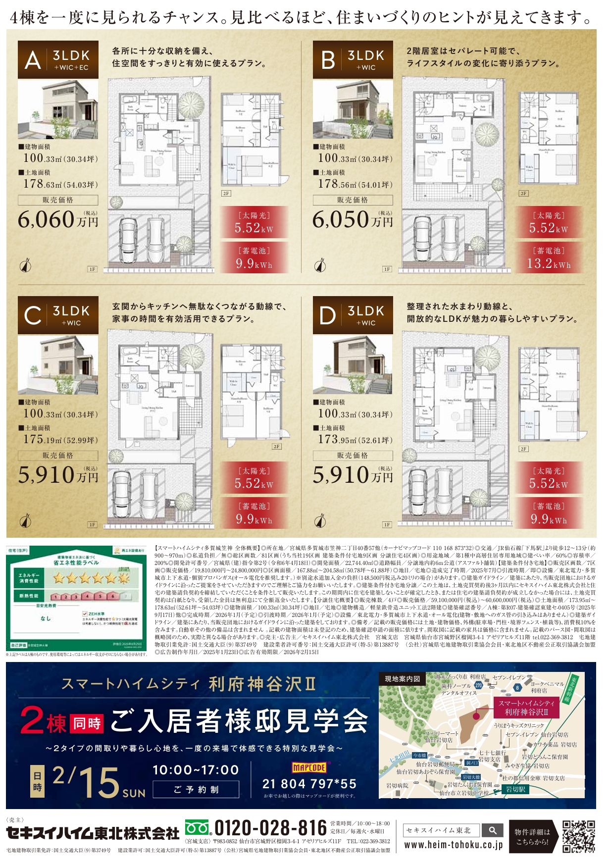 12月に完成したばかりの建売住宅4棟を一度にご見学いただけます! 間取りのご参考や、笠神の新しい分譲地の雰囲気を体感していただける見学会となっております。 もちろんご見学だけでも可能ですので、お気軽にお越しください。 ↓↓↓ご予約はこちらから↓↓↓ https://www.heim-tohoku.co.jp/contact/kengaku_annai.html?event_id=1893 *開催中のご予約特典キャンペーンのご利用も可能です。(開催期間:1月4日(日)~3月31日(火))