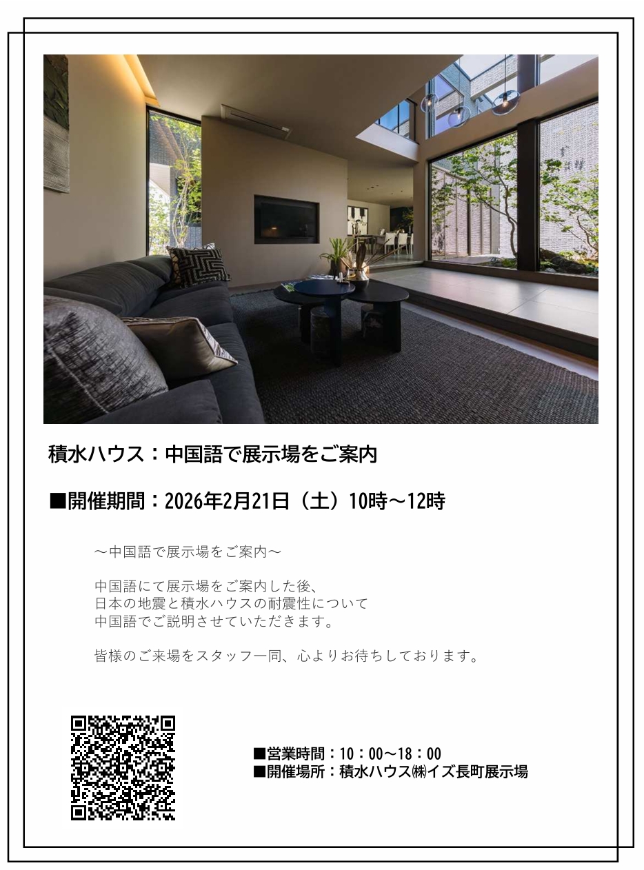 中国語にて展示場をご案内した後、 日本の地震と積水ハウスの耐震性について 中国語でご説明させていただきます。 皆様のご来場をスタッフ一同、心よりお待ちしております。
