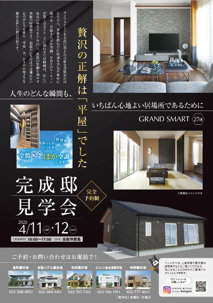 4/11(土)・12(日)名取市愛島にて完成邸見学会を開催いたします!