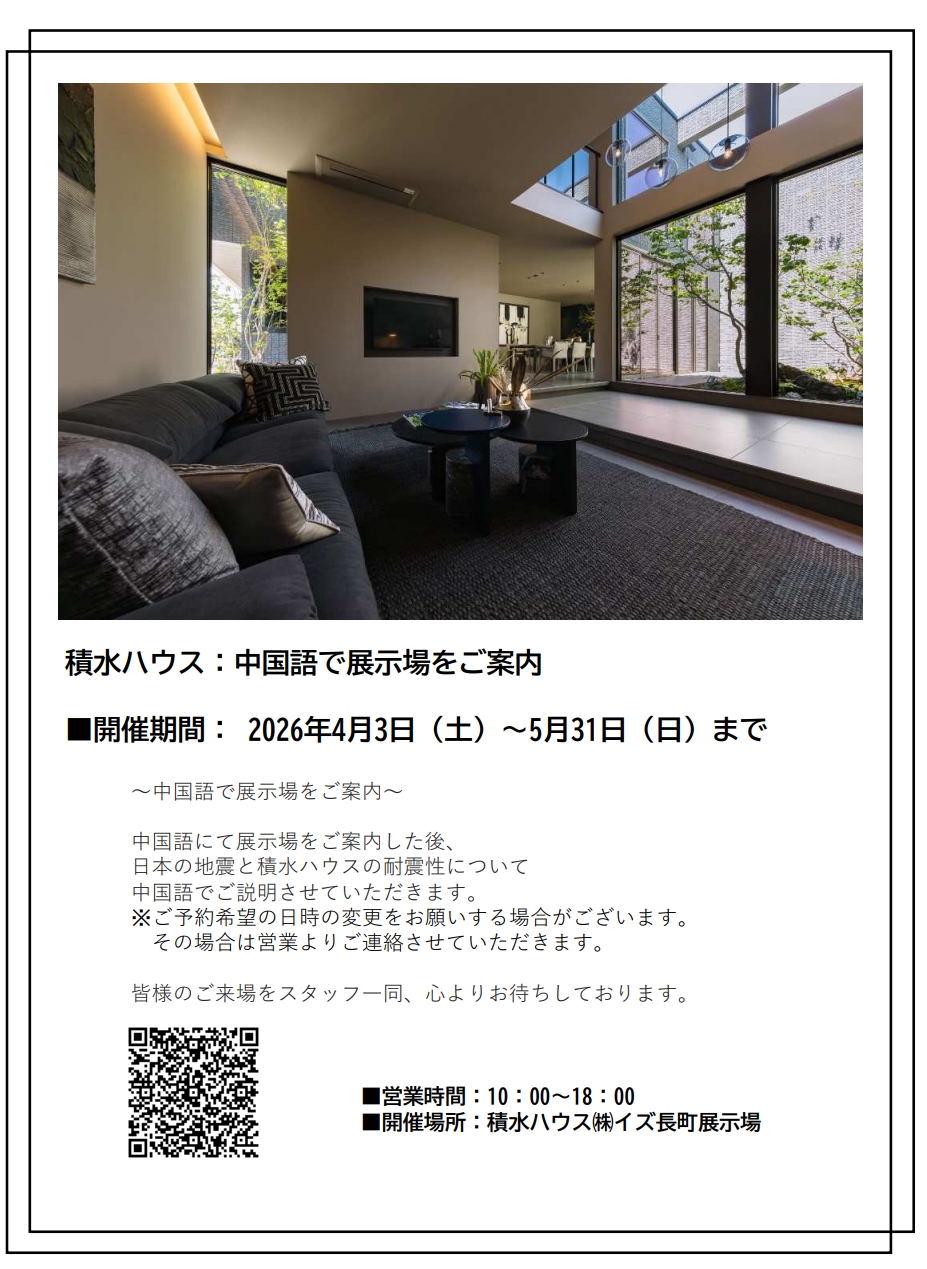 中国語にて展示場をご案内した後、 日本の地震と積水ハウスの耐震性について 中国語でご説明させていただきます。 皆様のご来場をスタッフ一同、心よりお待ちしております。 ※ご予約ご機能の日時から変更をお願いする場合がございます。 その場合は営業よりご連絡させていただきます。