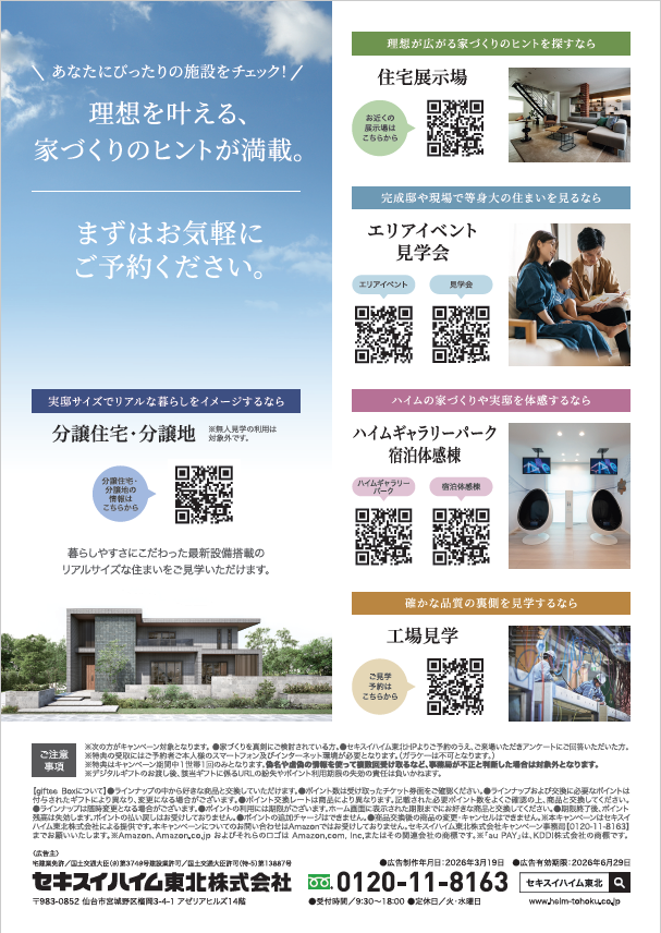 ※分譲住宅・分譲地、住宅展示場、エリアイベント・見学会、ハイムギャラリーパーク、宿泊体験棟、工場見学をHPから事前予約⇒ご来場⇒アンケートのご記入をいただいた方に限ります。
